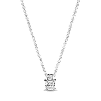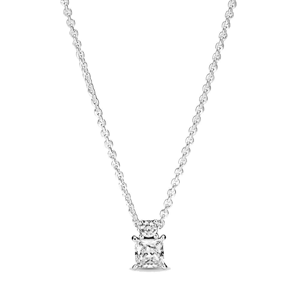 Collier scintillante con pendente quadrato e rotondo è un classico moderno, un gioiello che resisterà al trascorrere del tempo. Rifinito a mano e realizzato in argento sterling 925, il collier include un pendente che presenta sfavillanti pietre di zirconia cubica incolori con due tagli e due dimensioni diverse - una pietra rotonda posizionata sopra una pietra quadrata -, agganciate alla catena da lunghe griffe.