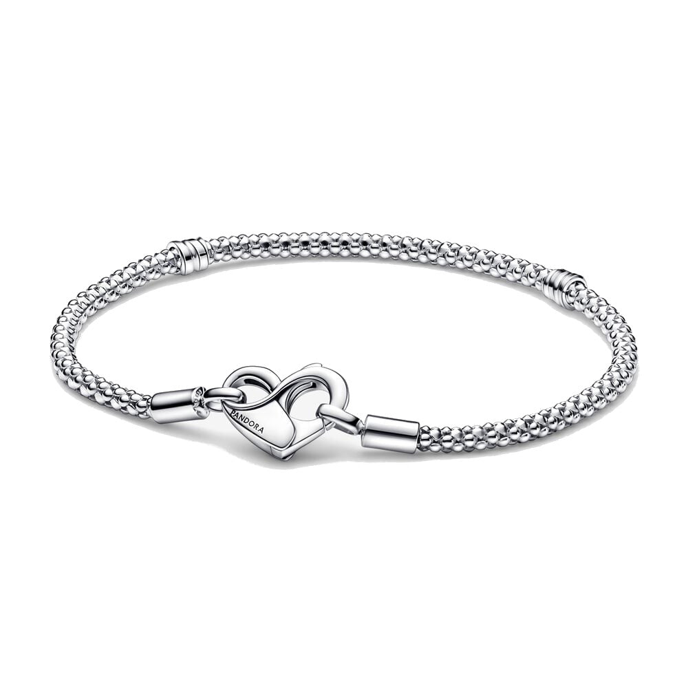 Bracciale Maglia Geometrica con Chiusura a Cuore. Rifinito a mano e realizzato in Argento Sterling 925, il bracciale presenta una catena sferica a trama borchiata flessibile e una chiusura a cuore apribile decorata dal simbolo dell'infinito, che appare anche all'interno. Importante: è possibile inserire un massimo di 16-18 charm o pendenti.