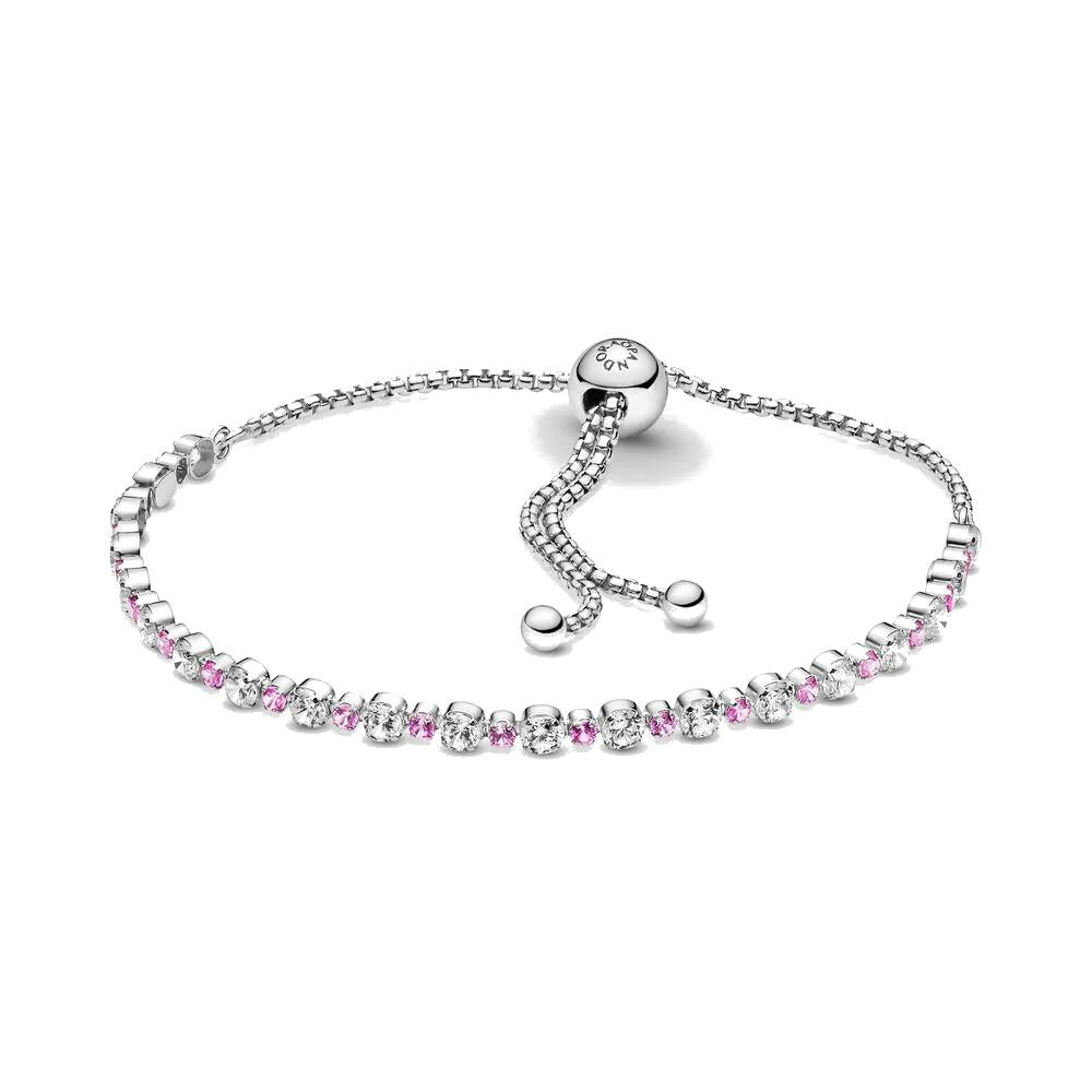 Bracciale regolabile in Argento Sterling 925. Rifinito a mano con due tonalità di dettagli scintillanti, questo bracciale tennis è impreziosito da pietre di zirconia cubica trasparenti e zaffiri sintetici rosa in misure alternate, per aggiungere uno aspetto contrastante al gioiello. Il bracciale si presenta con una pratica chiusura regolabile che consente di indossarlo nella misura perfetta.