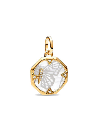 Charm Medallion Pearlescent Butterfly Pandora ME. Un contorno ottagonale placcato Oro 14k incornicia un disco centrale in madreperla creata dall'uomo in bioresina bianca, con sagome di farfalle incise al laser. La cornice ottagonale presenta dettagli triangolari decorati da luminose pietre di zirconia cubica incolore. A uno dei triangoli si collega una linea con pietre, raffigurante la testa e il corpo della farfalla.