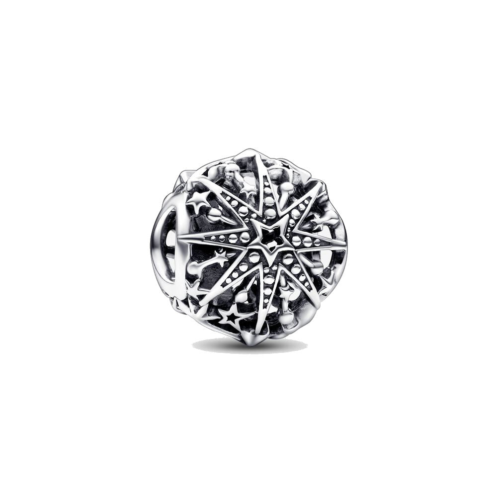 Questo charm in Argento Sterling 925 è decorato da un motivo a stella a cinque punte intagliato su entrambi i lati, all'interno di una stella più grande a otto punte con intricati dettagli openwork e micro-sfere, che creano il look di un fiocco di neve.