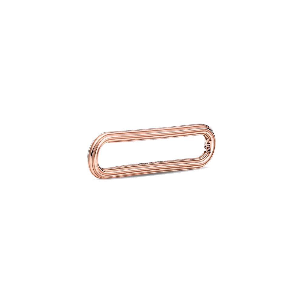 Link Pandora ME con placcatura in oro rosa 14k. Il gioiello versatile, che presenta linee scanalate che girano intorno alla superficie, può essere inserito tra connettori.