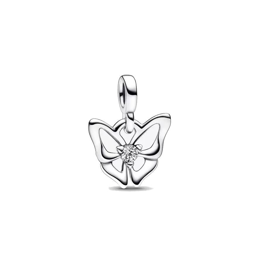 Mini Pendente Butterfly Pandora ME. Le ali in Argento Sterling 925 con lavorazione openwork sono collegate a una scintillante pietra con taglio brillante rotondo al centro della farfalla. L'anello passante è chiuso e può essere inserito solo su connector, link apribili o orecchini Pandora ME.