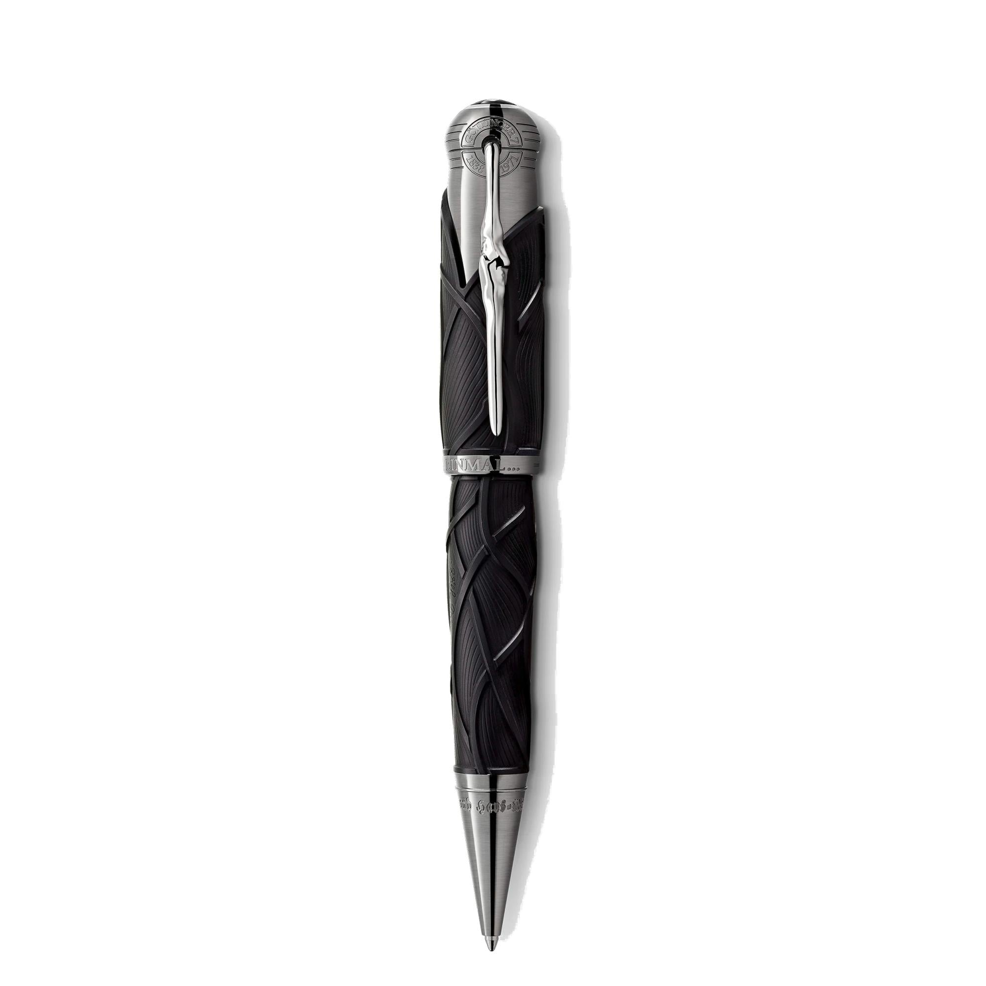 La Montblanc Writers Edition Homage to Brothers Grimm è dedicata a Jacob e Wilhelm Grimm e celebra il loro lavoro di raccolta e rielaborazione delle fiabe popolari tedesche ed europee, fra le quali ricordiamo alcune delle più celebri come "Biancaneve", "Cenerentola" e "La bella addormentata". La silhouette complessiva dello strumento da scrittura riprende la forma di un antico bastone da montagna e il colore nero evoca l'oscurità delle foreste, scenario abituale delle fiabe popolari dei fratelli Grimm. Inoltre, il motivo a onde sul corpo e sul cappuccio è ispirato ai capelli di Raperonzolo ed evoca anche la forma delle radici, riferimento al fatto che i fratelli Grimm vedevano il loro lavoro linguistico come una "ricerca legata alle radici". Il cappuccio è coronato dall'emblema Montblanc in pregiata resina. Quando viene ruotata, la clip finitura platino, ispirata a un pezzo di legno nodoso, rivela a sorpresa la silhouette del profilo dei fratelli Grimm.