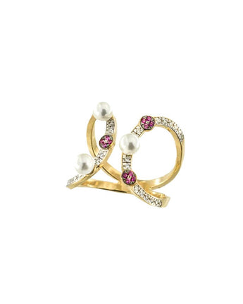 Anello Rue des Mille, realizzato in argento 925 con placcatura in oro 18 kt. Il disegno dell'anello è contrariè con doppio ovale, con perle di conchiglia micro size e ziroconi bianchi e rossi. L'anello è aperto e si può quindi regolare la misura maneggiandolo con delicatezza.