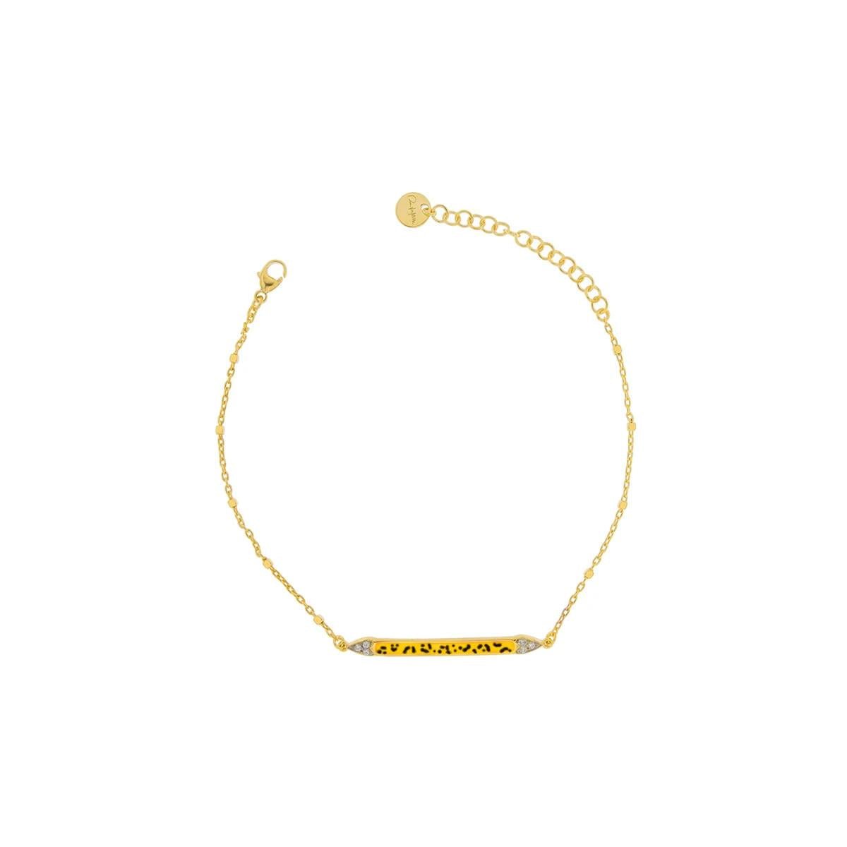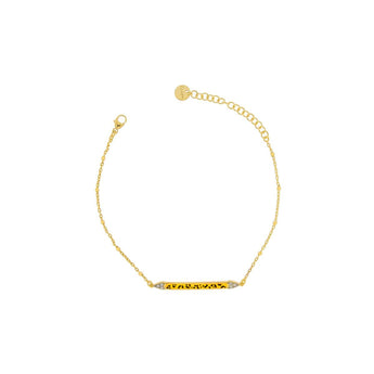 Bracciale in Argento dorato colore oro giallo, a catenella intervallata da piccole sfere con lavorazione diamantata e con Barretta centrale smaltata con smalto Giallo maculato. Ai lati della barretta sono incastonate degli zirconi bianchi.