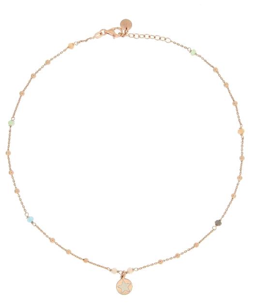 Girocollo Rue des Mille in argento925, placcatura in oro rosa e pietre colorate, ciondolo centrale con disegnata una stella.