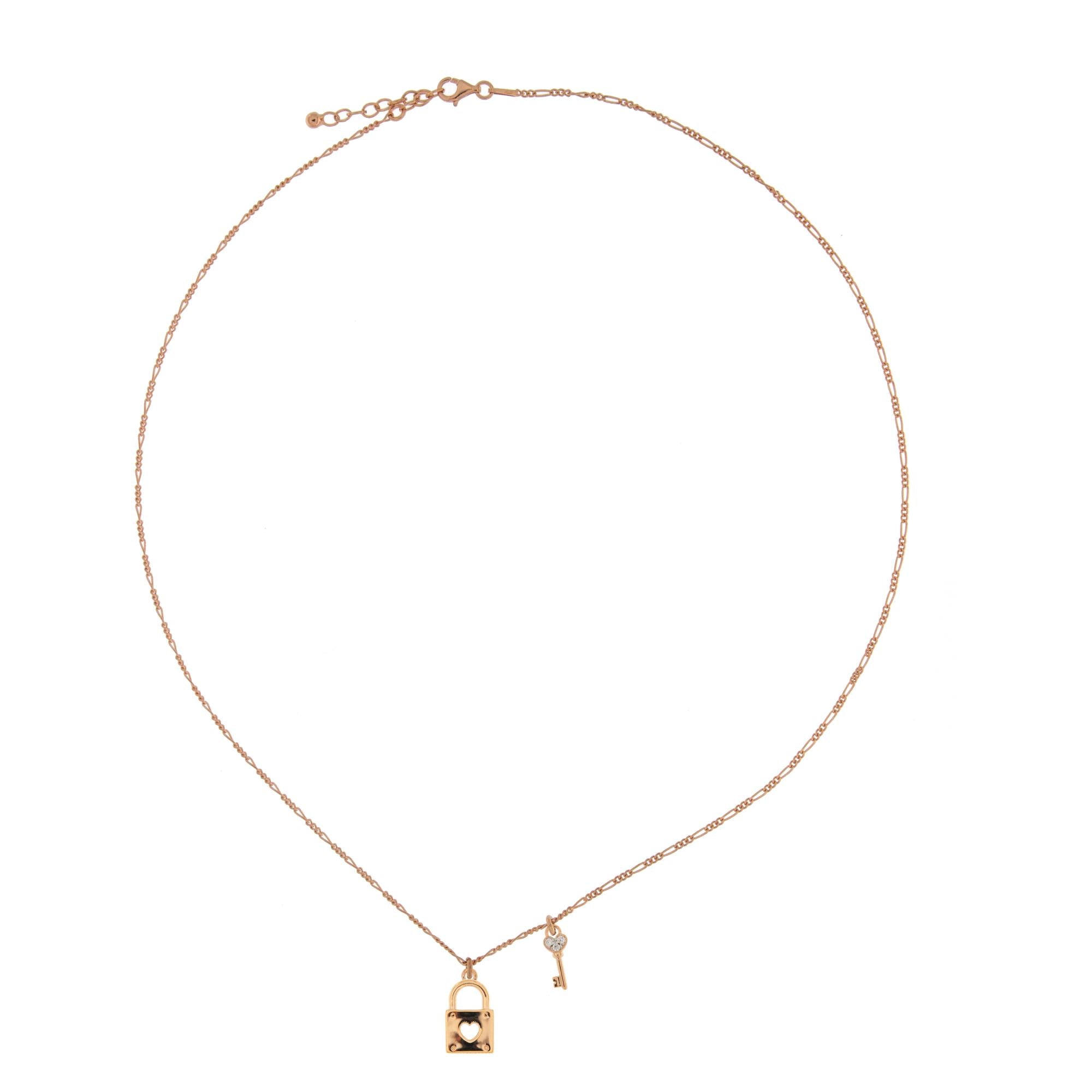 Girocollo in Argento dorato colore oro rosa, catenella con 2 ciondoli: Lucchetto con foro della chiave a forma di cuore e chiave con cuoricino con zirconi incastonati