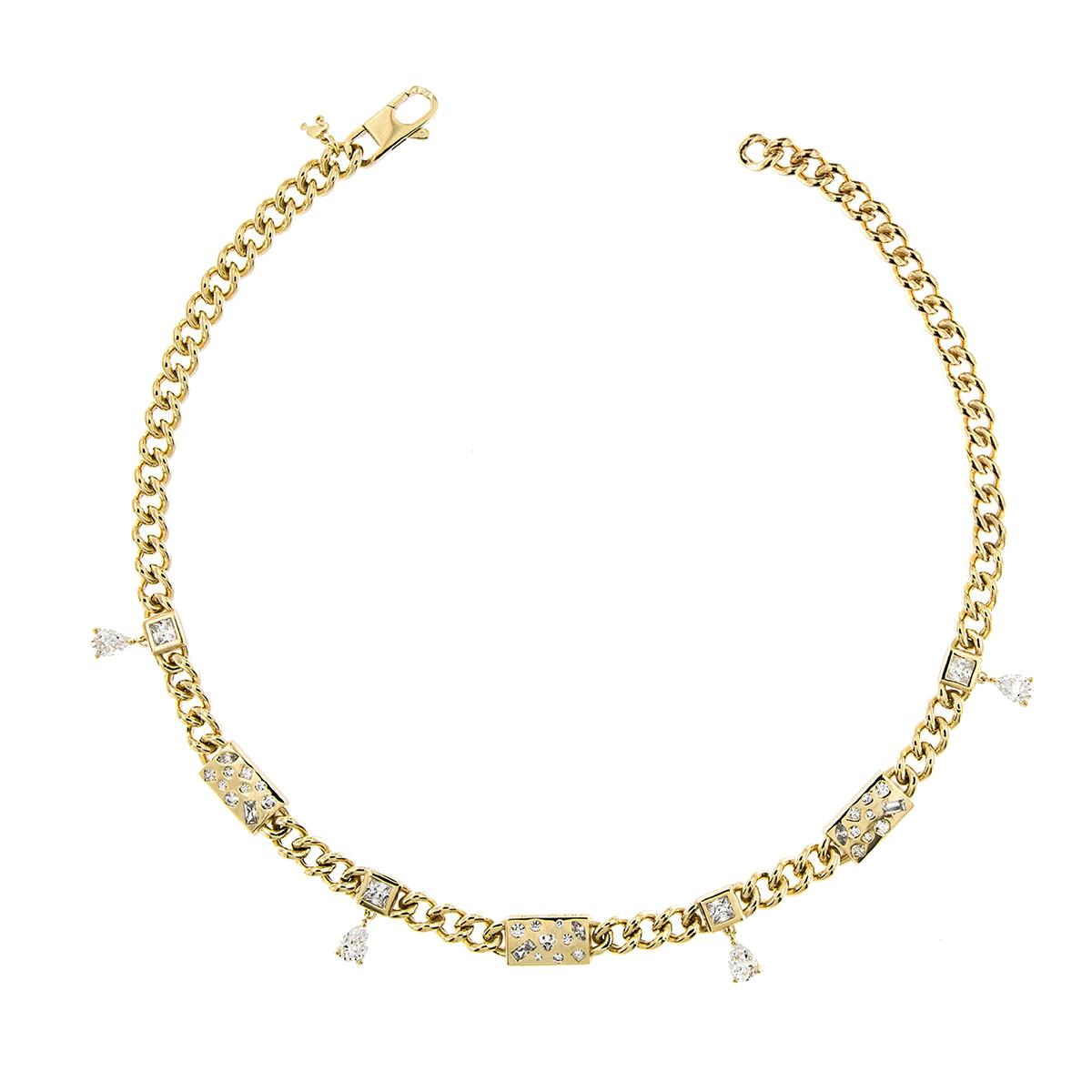 Girocollo con catena groumette bold, placca in argento bagnato in oro 18 kt intervallato da luminose pietre cubic zirconia bianco con tagli e sfaccettature diverse e pendenti con pietra taglio goccia
