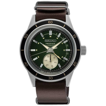 Orologio Seiko presage da uomo con cassa di diametro 40,80 mm in acciaio inossidabile, vetro hardlex e cinturino in pelle. Meccanismo automatico calibro 4R57 con 29 rubini e indicatore di riserva di carica. La resistenza all'acqua è di 5 bar.