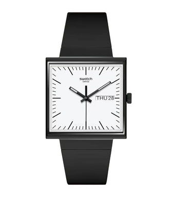 L'esclusivo orologio Swatch quadrato What if Black è alimentato da un movimento al quarzo e impermeabile fino a 2 bar di pressione. Il cinturino in materiale biologico è dotato di fibbia bioceramica e cassa bioceramica, facenti parte della collezione What If?. Disponibile in un elegante nero/bianco, con un design quadrato.