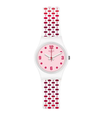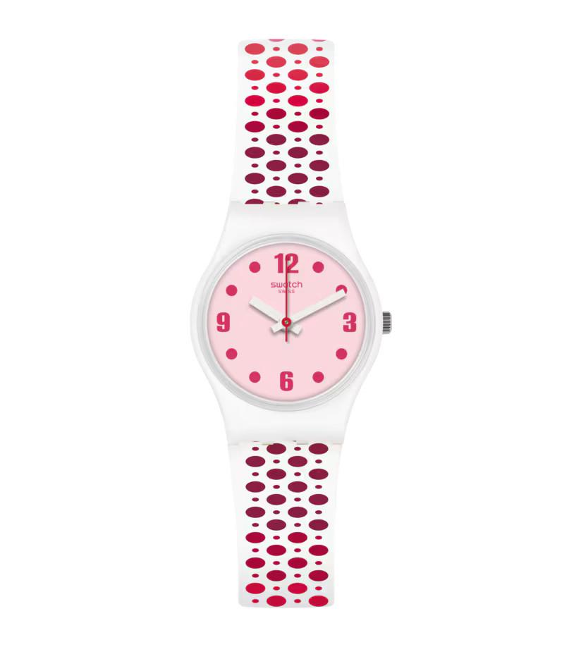 PAVERED (LW163) apre la strada allo stile di questa stagione con un motivo a pois rosa e rossi che salta, salta e scoppietta. Il quadrante rosa è il ponte perfetto tra i due motivi.