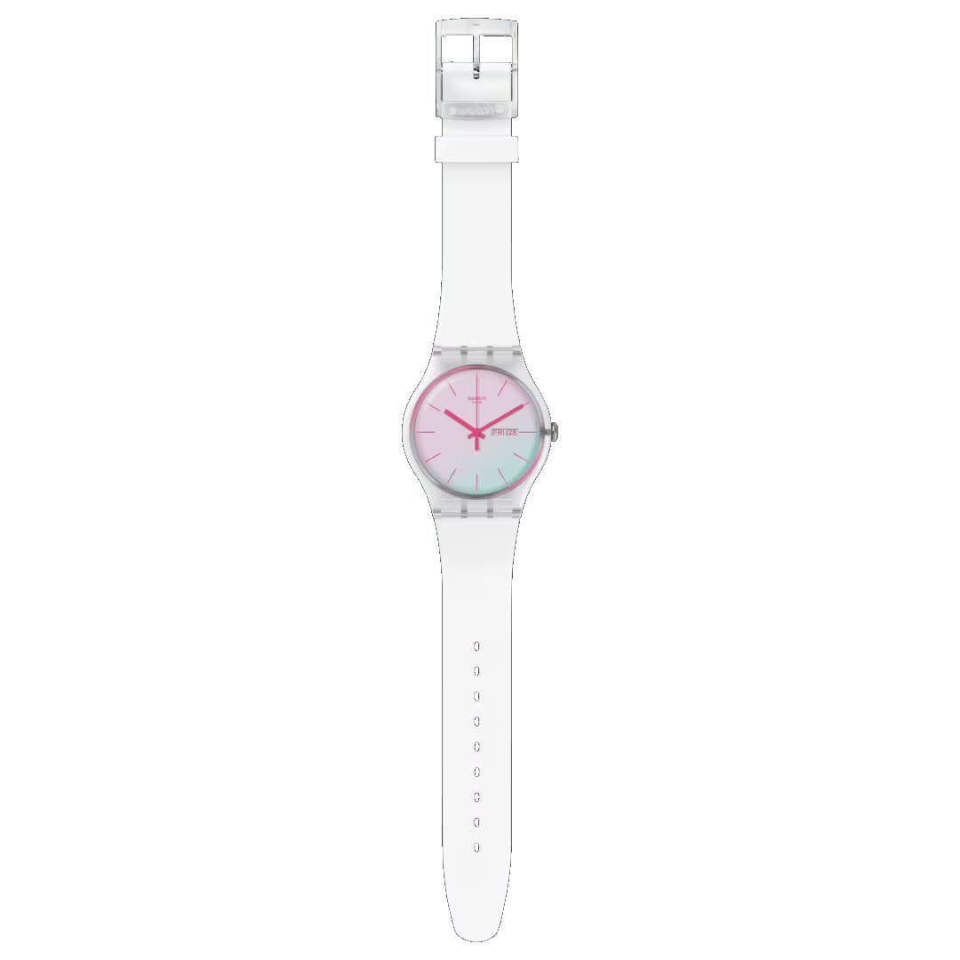 Eleganza e sostenibilità si fondono in questo orologio dal design moderno e fresco. Il quadrante bianco è impreziosito da indici rosa e protetto da un vetro Solar Spectrum che riflette la luce con effetti unici. La cassa trasparente è realizzata in materiale di origine biologica, in perfetta sintonia con un approccio eco-consapevole.