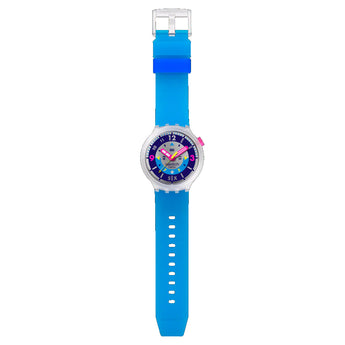 La cassa oversize da 47 mm in polimero trasparente opaco è abbinata a una lunetta coordinata, mentre il cinturino in silicone blu trasparente opaco, dal design testurizzato, è completato da dettagli sofisticati: passanti in diverse tonalità di blu e una mezza fibbia trasparente opaca in alluminio.