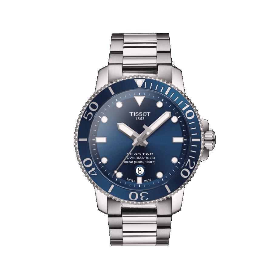 Orologio Tissot Seastar 1000 Powermatic 80, cassa in acciaio inossidabile con un diametro di 43 mm. Quadrante di colore blu con ghiera girevole unidirezionale. Meccanismo automatico Swiss Made Powermatic 80, con funzione di tempo e datario. Cinturino in acciaio inossidabile con chiusura déployante di sicurezza, prolunga sub e pulsanti, bracciale intercambiabile a sgancio rapido. Vetro in zaffiro antigraffio. Resistenza all'acqua di 30 bar.
