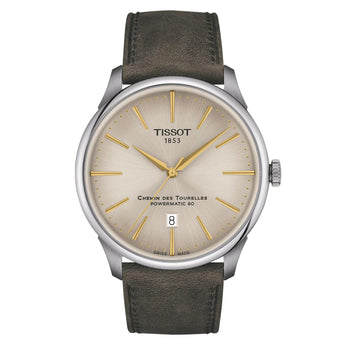 Orologio Tissot Chemin des Tourelles , cassa in acciaio inossidabile con un diametro di 42 mm, quadrante di colore avorio con indici e lancette colore oro. Il vetro è in zaffiro bombato antigraffio con trattamento antiriflesso. Il meccanismo è automatico Powermatic 80 con una riserva di carica fino ad 80 ore. Il cinturino è in pelle con chiusura intercambiabile a sgancio rapido, chiusura a farfalla con pulsanti.