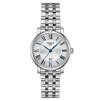 Orologio Tissot da donna con cassa in acciaio inossidabile di diametro 30 mm, quadrante colore argento con numeri romani dipinti. Meccanismo al quarzo Swiss Made con funzione di solo tempo. Vetro in zaffiro antigraffio. La resistenza all'acqua è di 5 bar. Bracciale in acciaio inossidabile con chiusura a farfalla.