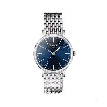 Orologio Tissot everytime, cassa in acciaio inossidabile con un diametro di 34 mm, quadrante di colore blu, vetro in zaffiro antigraffio. Il meccanismo è al quarzo Swiss Made con funzione di solo tempo. Il bracciale è in acciaio inossidabile. La resistenza all'acqua è di 5 bar.