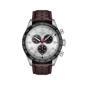 Orologio Tissot PRS 516, cassa in acciaio inossidabile di forma rotonda con un diametro di 45mm, vetro in zaffiro antigraffio, movimento al quarzo Swiss made modello ETA G10.212, il quadrante è colore argento con numeri arabi e indici.