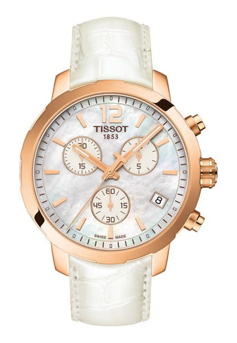 Orologio Tissot Quickster con funzioni di Cronografo con Cassa in Acciaio ricoperta in PVD oro Rosa e Cinturino in Pelle bianca, Quadrante in Madreperla bianca, Datario e Vetro Zaffiro.