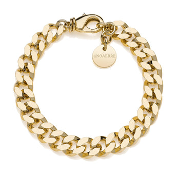 Bracciale di catena grumetta diamantata con bagno in oro e chiusura a moschettone con allungamento. Misura 19 cm.