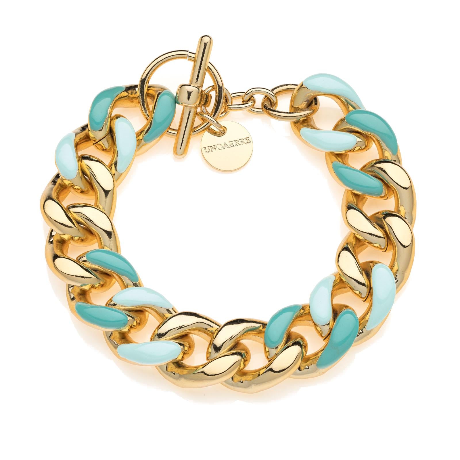 Bracciale in bronzo dorato con catena grumetta, smalto azzurro e chiusura a T-bar.