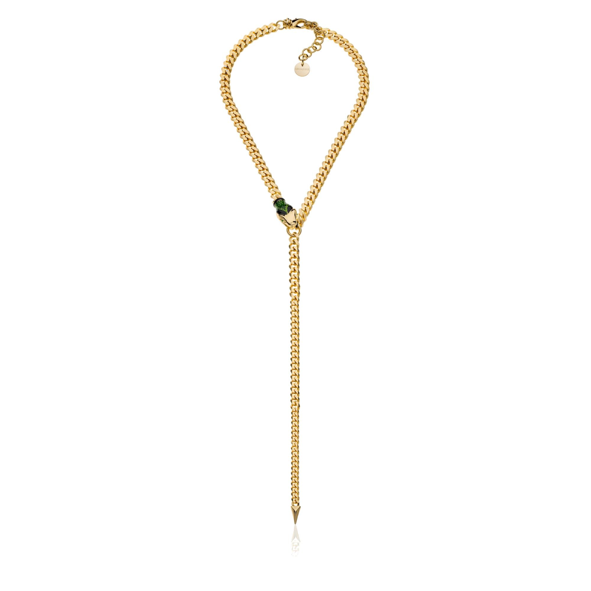 Collier di catena grumetta battuta in bronzo dorato con testa di serpente e finitura in smalto verde.