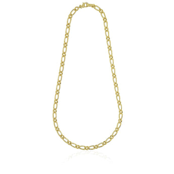 Eleganza senza tempo e carattere deciso si incontrano in questa collana da uomo in catena fantasia grumetta e figaro. Realizzata in resistente bronzo dorato, è il perfetto connubio tra tradizione orafa e stile contemporaneo. Il design ricercato, impreziosito dalla combinazione di due catene iconiche, dona un look distintivo e sofisticato, ideale per valorizzare qualsiasi outfit.