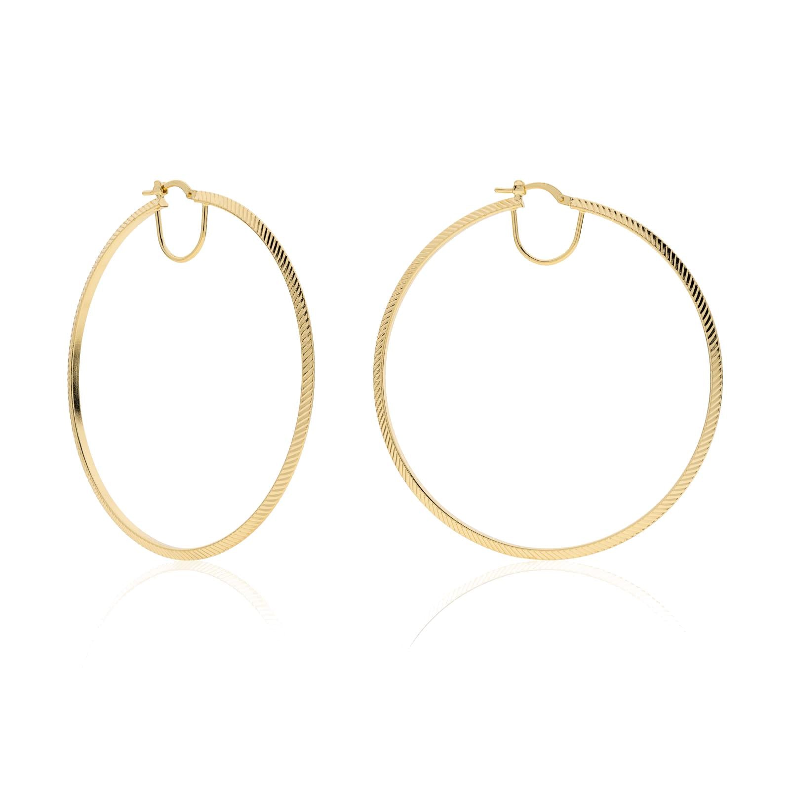 Gli orecchini unoaerre a cerchio dorati maxi sono tornati di moda. Ispirati al classico design minimal chic, si presentano con finitura diamantata e chiusura a baionetta dal diametro di 6 cm. Portali da soli per un look unico ed elegante. Abbinali al tuo stile e crea un look che si distingue.