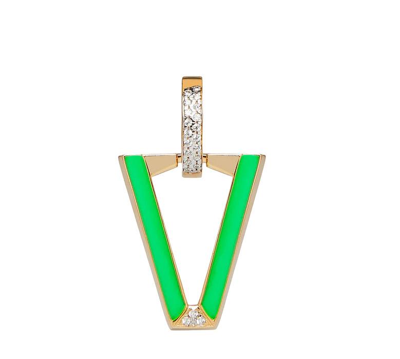 Mono orecchino Valentina Ferragni studio, realizzato in argento 925 con placcatura oro giallo, smalto verde e pavè di zirconi.