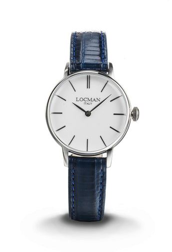 Solo Tempo al quarzo, cassa in acciaio 32 mm. Vetro minerale naturale con trattamento zaffiro. Cinturino in Pelle Blu. Impermeabile fino a 5 atmosfere (50 metri).