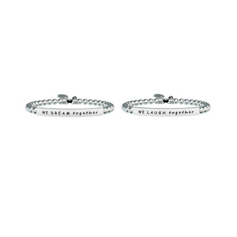 Sognare insieme, ridere insieme. Io e te, amiche per la vita, amiche per la pelle. Set di due bracciali elastici con sfere in acciaio e piastra rettangolare Amiche. • Incisione smaltata • Chiusura con cordino • Misura regolabile, diametro da 5 a 6,5 cm • Materiale: Acciaio 316L • Designed by Kidult in Italy