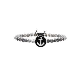 I valori di un vero uomo sono un punto fermo in mezzo all'oceano che nessuna marea potrà mai spostare.Bracciale con sfere in agata grigia e piastra tonda Ancora in acciaio di colore nero. • Chiusura con cordino • Misura regolabile, diametro da 6 a 8 cm • Materiale: Acciaio 316L con Pvd Nero, Agata, Nylon • Designed by Kidult in Italy