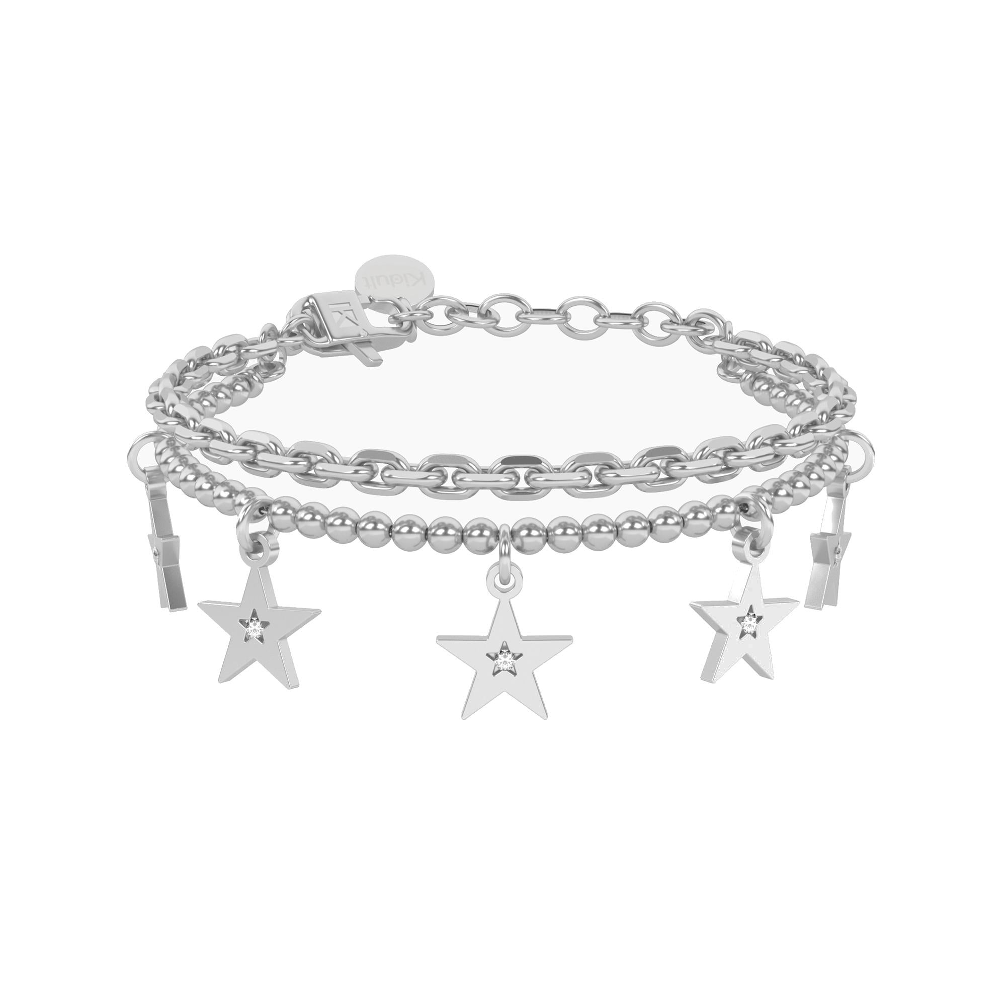 Bracciale da donna regolabile in acciaio con catena forzatina diamantata, sfere e ciondoli a forma di stella con cristalli.