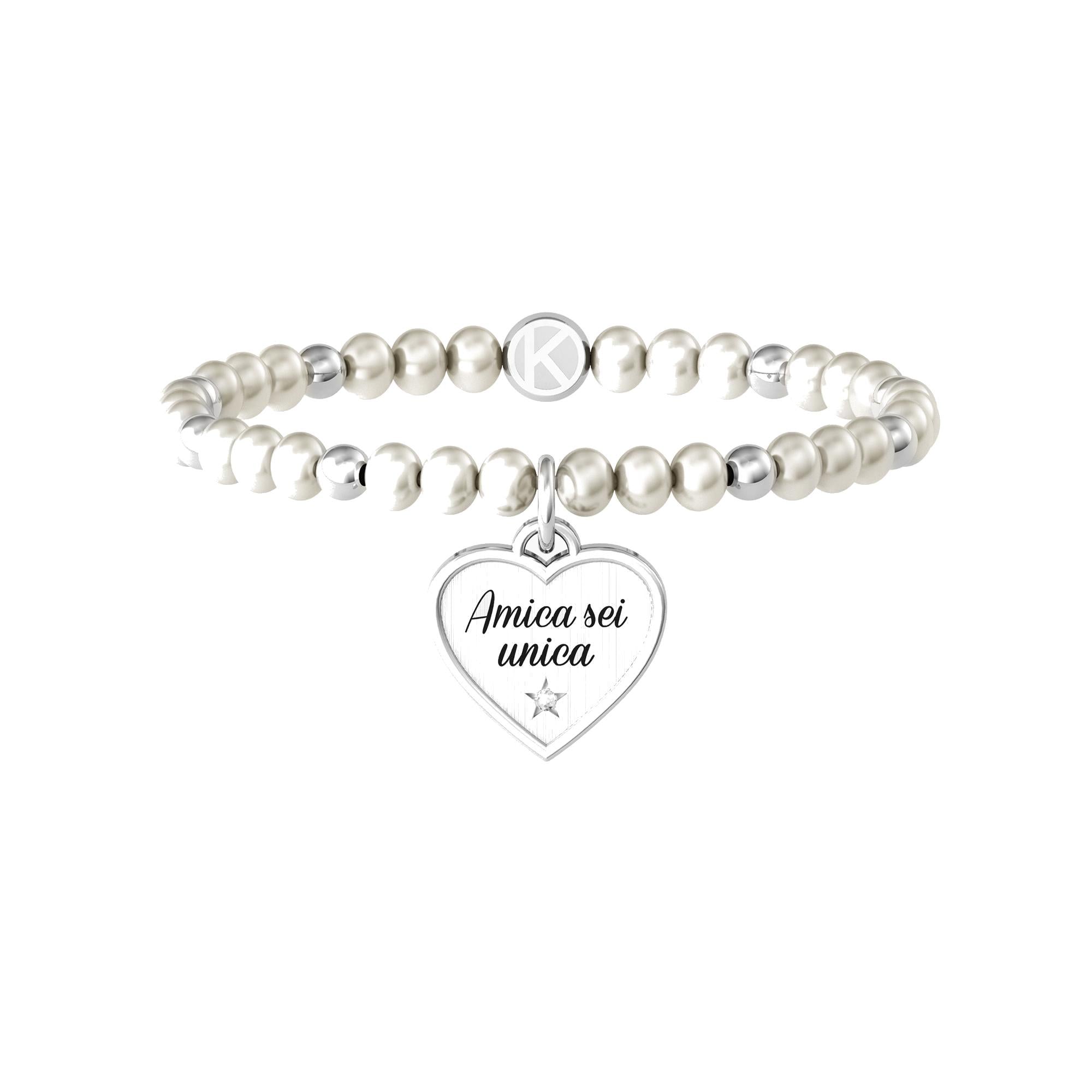 Scopri il Bracciale Kidult amica con perle e ciondolo cuore. Realizzati con materiali di prima scelta tra acciaio 316L, perle coltivate e un cristallo dal diametro di 1.5mm, questi bracciali sono un regalo perfetto. Il ciondolo cuore ha 17x17,5mm di dimensioni, le perle hanno un diametro di 5/5,5mm e la circonferenza della misura unica è di 18 cm.
