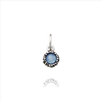 Charm in argento 925 con lavorazione perlage. Il ciondolo si può montare sia su bracciali raspini che su girocolli. Al centro c'è incassata un'agata blu.