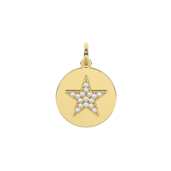 Ciondolo tondo in acciaio e PVD giallo satinato e lucido con elemento a forma di stella con cristalli bianchi e scritta "Friends are my happy place".