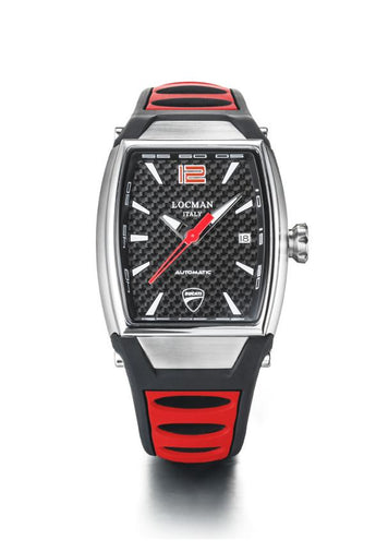 La cassa a forma tonneau, proposta in acciaio satinato con dettagli lucidi, è impermeabile fino a 100 metri e racchiude un movimento meccanico automatico elaborato S.I.O. (Scuola Italiana di Orologeria), reso visibile da un oblò di cristallo sul fondo in titanio. Il quadrante in fibra di carbonio, riporta sia il logo Ducati a ore 6, che il logo Locman a ore 3. Il cinturino, in silicone anallergico traforato, è fissato alla struttura in acciaio tramite due anse a vite.