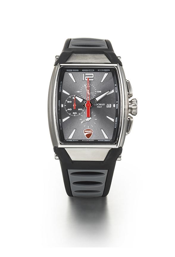 La cassa a forma tonneau, proposta in acciaio satinato con dettagli lucidi, è impermeabile fino a 100 metri e racchiude un meccanismo cronografo al quarzo. Il quadrante smaltato grigio con effetto sunray, riporta sia il logo Ducati a ore 6, che il logo Locman a ore 3. Il cinturino, in silicone anallergico traforato, è fissato alla struttura in acciaio tramite due anse a vite.
