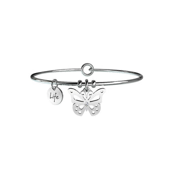 Ali leggere accarezzate dal vento, spirito libero che danza nel cielo con i colori dell'arcobaleno. Per lei ogni secondo vale come un giorno. Ti ricorderà di vivere intensamente ogni singolo momento. Bangle in acciaio con ciondolo Farfalla. • Cristallo sul ciondolo • Chiusura tonda • Misura unica, diametro 6 cm • Materiale: Acciaio 316L, Cristallo • Designed by Kidult in Italy