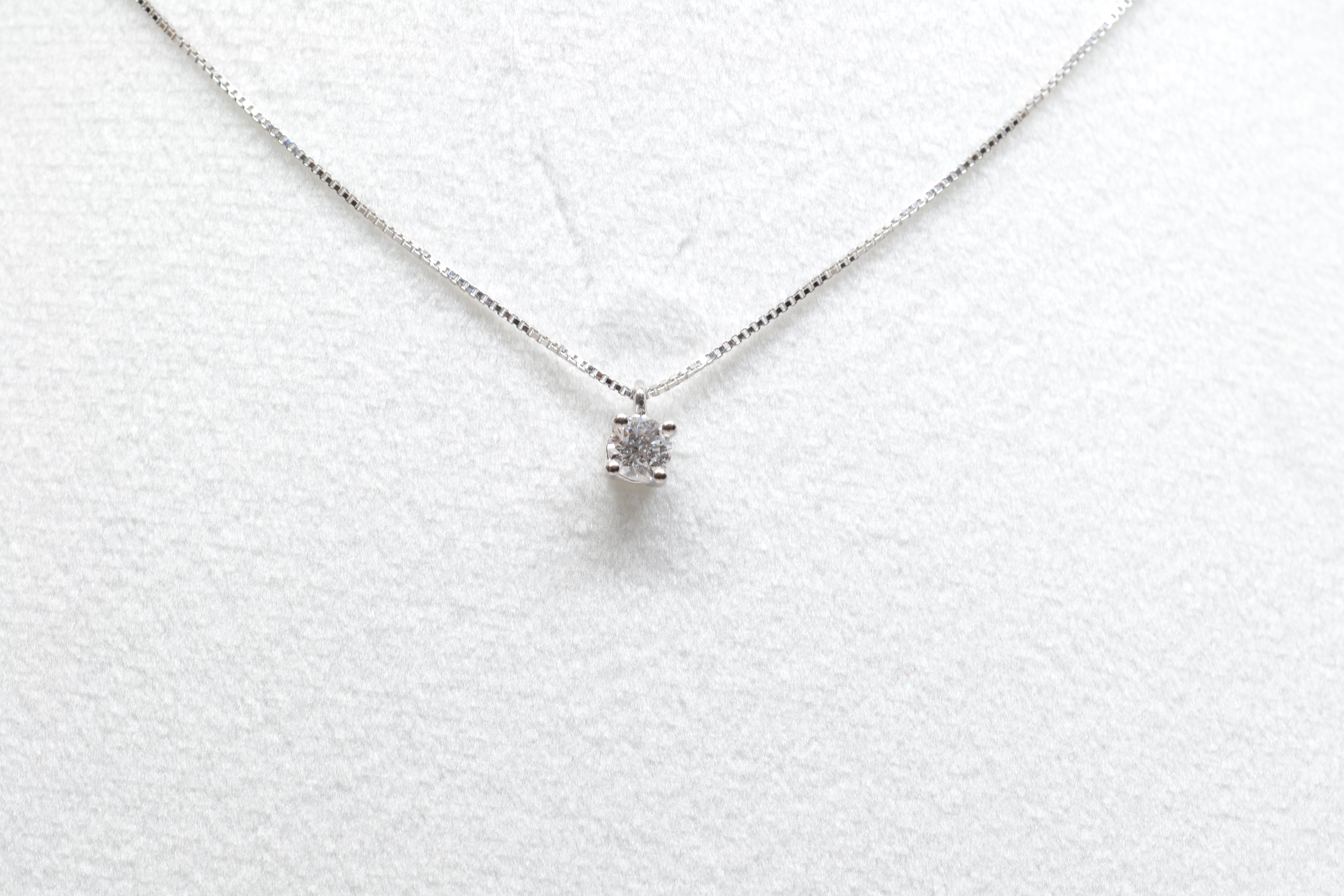 Girocollo in oro bianco 18kt con diamante naturale, il taglio è brillante con una caratura di 0,18 un colore G e qualità VS. La montatura è a 4 griffe. La chiusura è a moschettone.