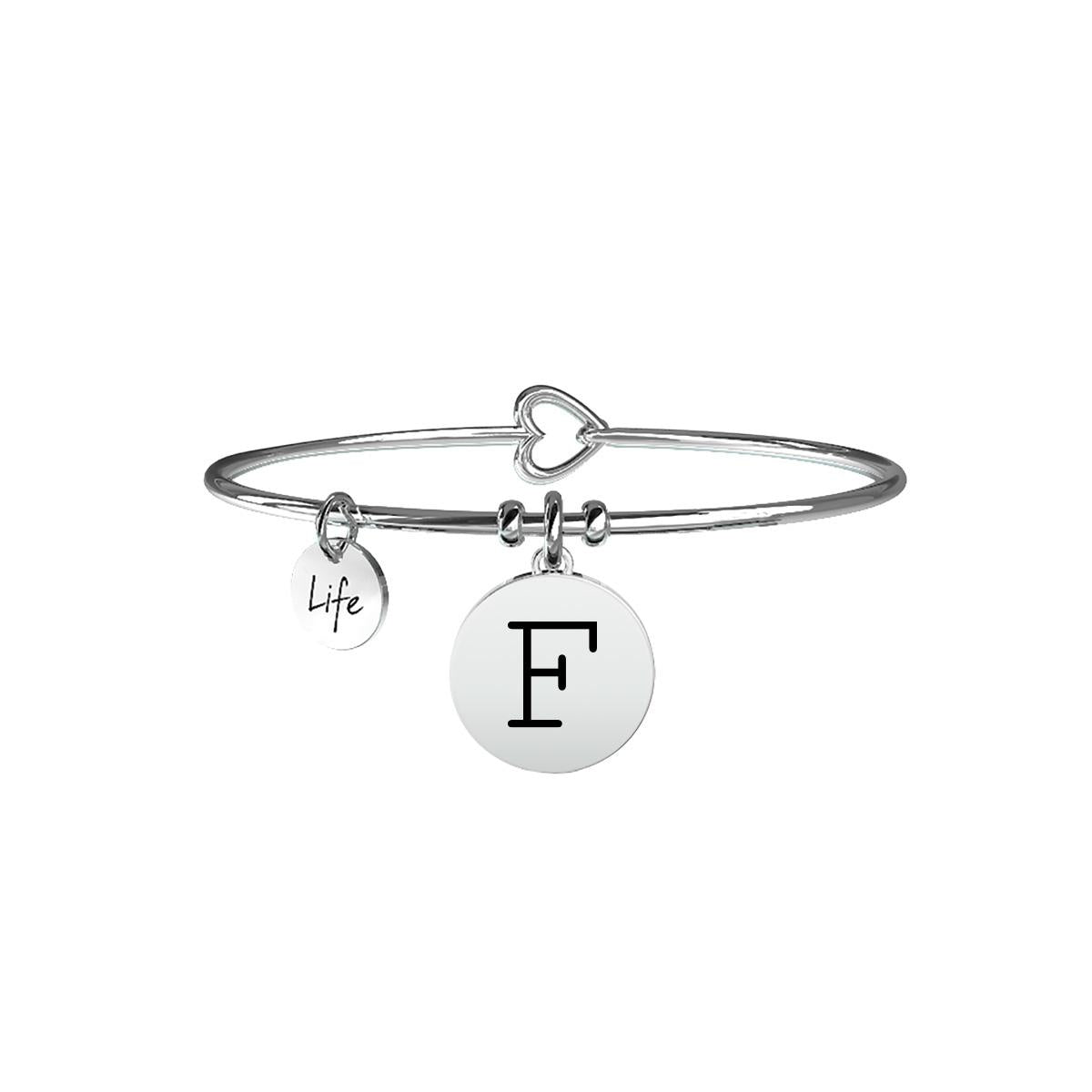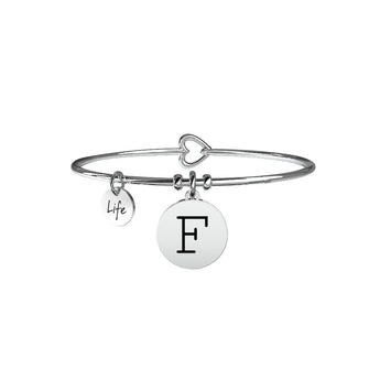 È l'iniziale del tuo nome, di una persona speciale o di qualcuno che ti sta a cuore. La tua lettera preferita, il principio di una parola, una frase, una storia. La vita è un alfabeto di emozioni.Bangle in acciaio con ciondolo tondo con lettera F. • Incisione smaltata sul ciondolo e cristallo sul retro • Chiusura a cuore • Misura unica, diametro 6 cm • Materiale: Acciaio 316L, Cristallo • Designed by Kidult in Italy