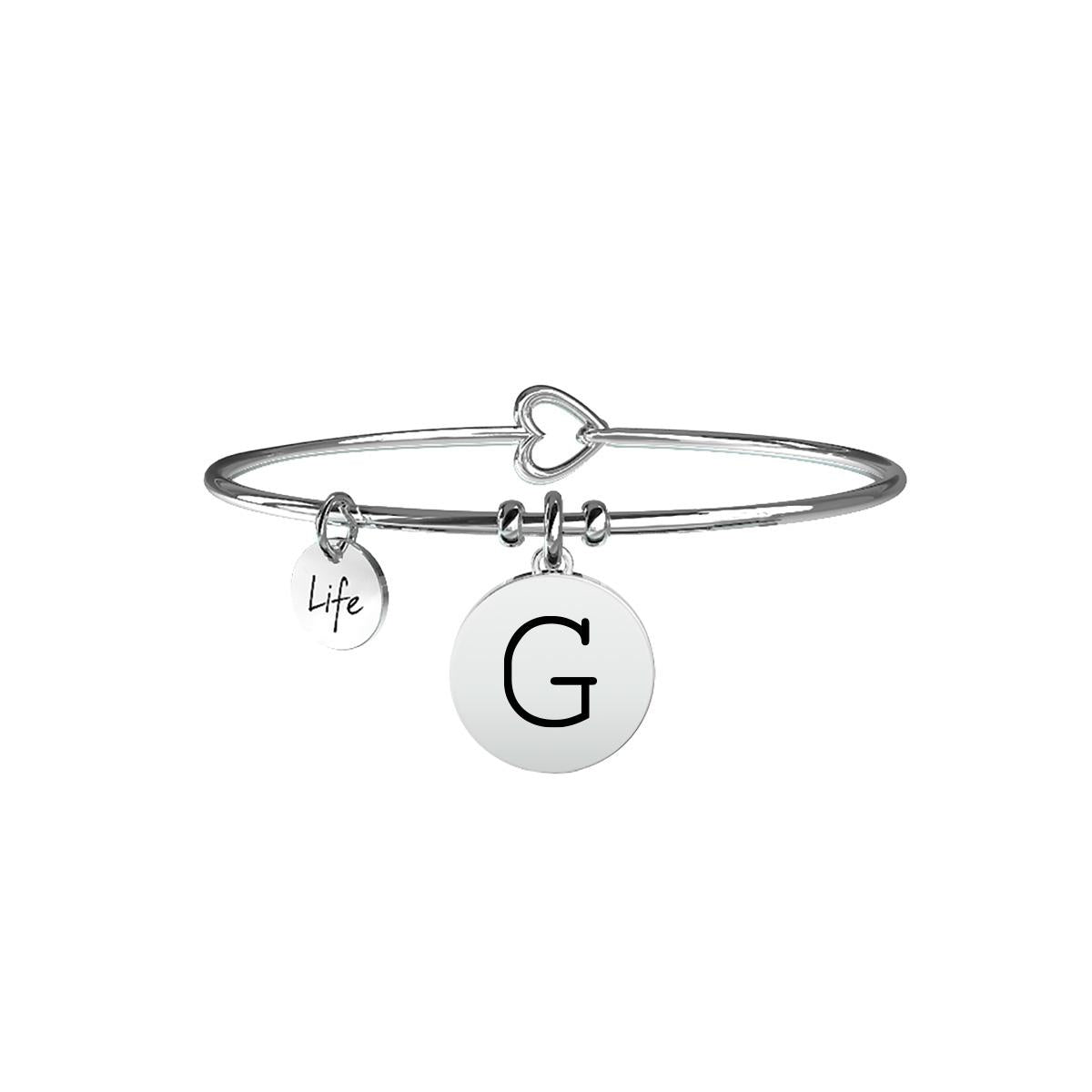 È l'iniziale del tuo nome, di una persona speciale o di qualcuno che ti sta a cuore. La tua lettera preferita, il principio di una parola, una frase, una storia. La vita è un alfabeto di emozioni.Bangle in acciaio con ciondolo tondo con lettera G. • Incisione smaltata sul ciondolo e cristallo sul retro • Chiusura a cuore • Misura unica, diametro 6 cm • Materiale: Acciaio 316L, Cristallo • Designed by Kidult in Italy