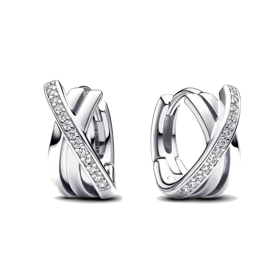 Orecchini Pandora della collezione Signature con linee intrecciate. Pietra zirconia cubica trasparente per uno stile elegante. In argento sterling 925, con dimensioni 9,4 mm x 12,6 mm x 13,5 mm. Aggiungi un tocco di lucentezza e classe al tuo outfit.