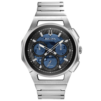 Orologio Bulova da uomo, cassa in acciaio inossidabile con un diametro di 44 mm e uno spessore di 10 mm. Il meccanismo è al quarzo con la particolarità di essere curvo come la cassa. Bracciale in acciaio inossidabile. Il quadrante è di colore blue. Water Resistant.