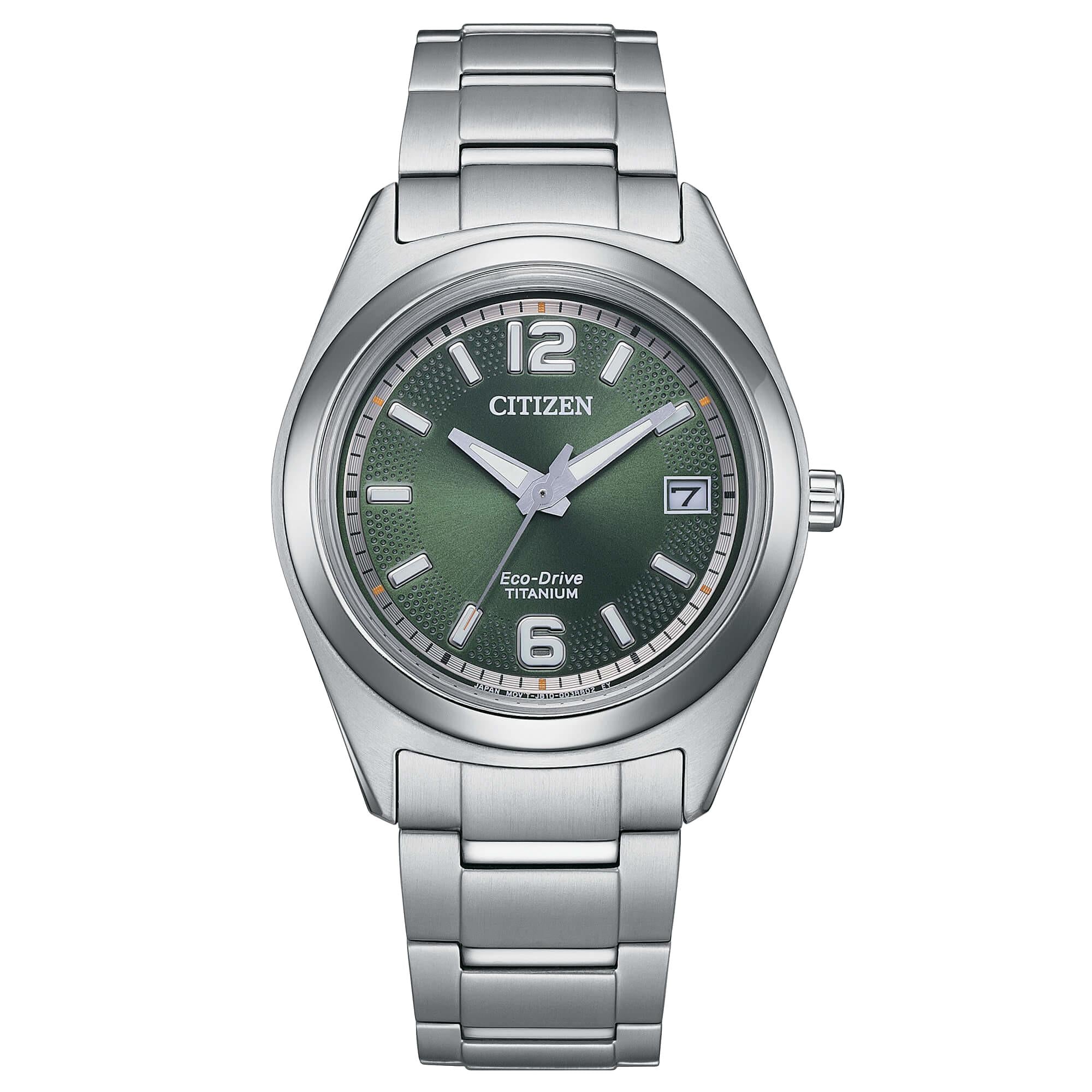 Orologio Citizen da donna. Cassa in super titanio con un diametro di 34 mm. Colore del quadrante verde. Meccanismo al quarzo con funzione di orario e datario. Vetro minerale. Resistenza all'acqua 3 bar.