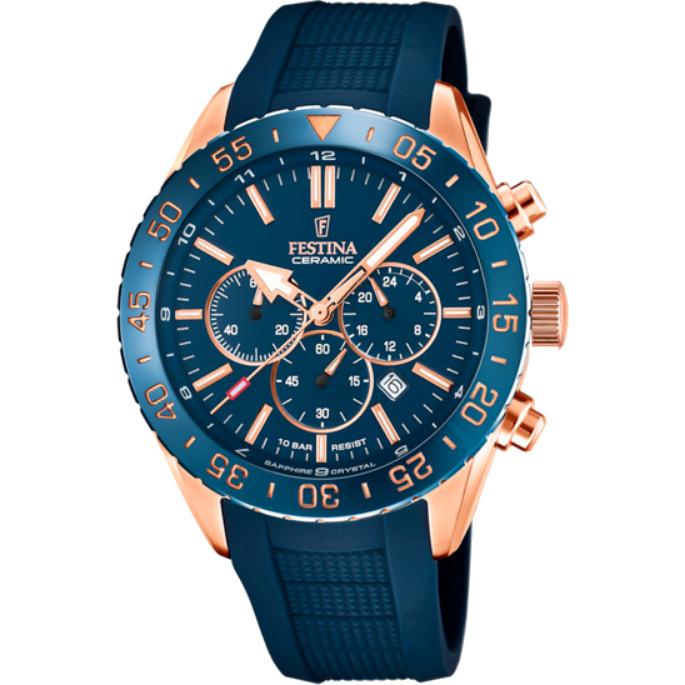 Orologio Festina della collezione ceramica, referenza F20516/1. L'orologio ha il cinturino in silicone di colore blu con la fibbia in acciaio trattato colore oro rosa ad ardiglione, il quadrante è di colore blu con gli index di colore oro rosa. Le funzioni sono orario, datario cronografo e indicatore delle 24 ore. Il vetro è in zaffiro antigraffio e la ghiera in ceramica.