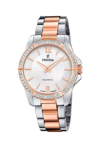 Orologio Festina da donna, cassa in acciaio inossidabile con un diametro di 34,5 mm e uno spessore di 9,25 mm. Il vetro è minerale mentre il quadrante è di colore bianco. Il movimento è al quarzo con funzione di solo tempo. La resistenza all'acqua è 5 bar.
