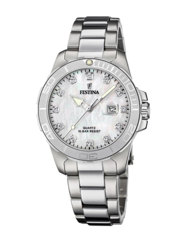 Orologio Festina da donna, referenza F20503/1, cassa in acciaio inossidabile di forma rotonda con un diametro di 34,5 mm e uno spessore 11,05. Il quadrante è madreperla con cristalli sulle ore. Il meccanismo è al quarzo con funzione di orario e datario. Il vetro è minerale. La resistenza all'acqua è di 5 Atm. Il bracciale è in acciaio 316l.