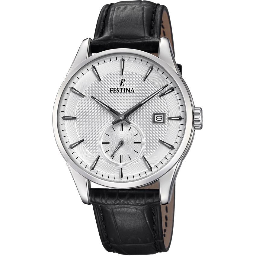 Orologio Festina da uomo della collezione retrò, referenza F20277/1, cassa in acciaio inossidabile di forma rotonda con un diametro di 41 mm. Il vetro è minerale. Il quadrante è bianco con indici applicati. Il meccanismo è al quarzo con funzione di solo tempo. La resistenza all'acqua è di 5 Atm. Il cinturino è in pelle nera.